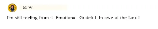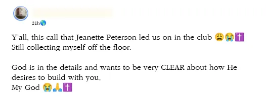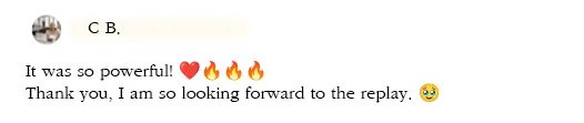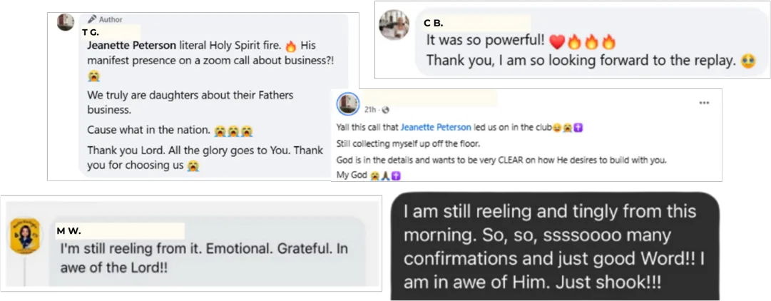 “Jeanette, oh my goodness girl. Today was SO powerful. Even after our call I was in the presence of God, scribbling so many ideas and so many notes. I just want to thank you. Thank you for bringing your expertise today, for preparing the room, and providing the space. I just love you so much!”
